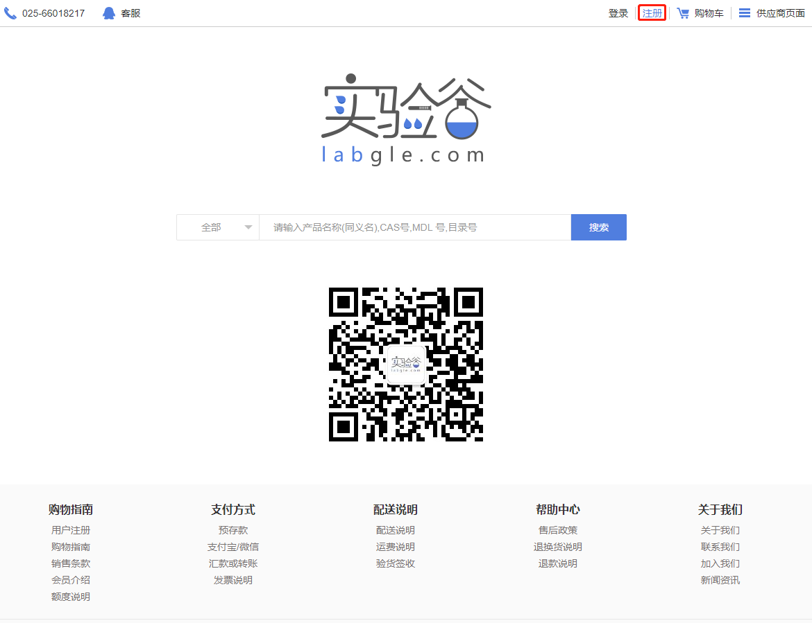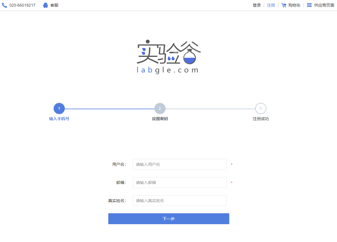 1.打开实验谷首页、任意产品页或介绍页,点击页面右上角"注册"进入用户注册界面。